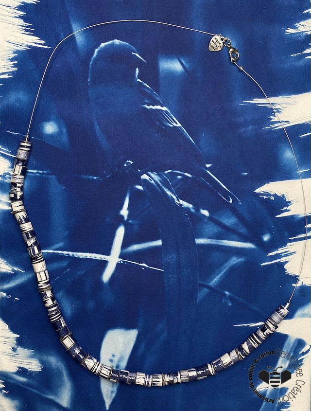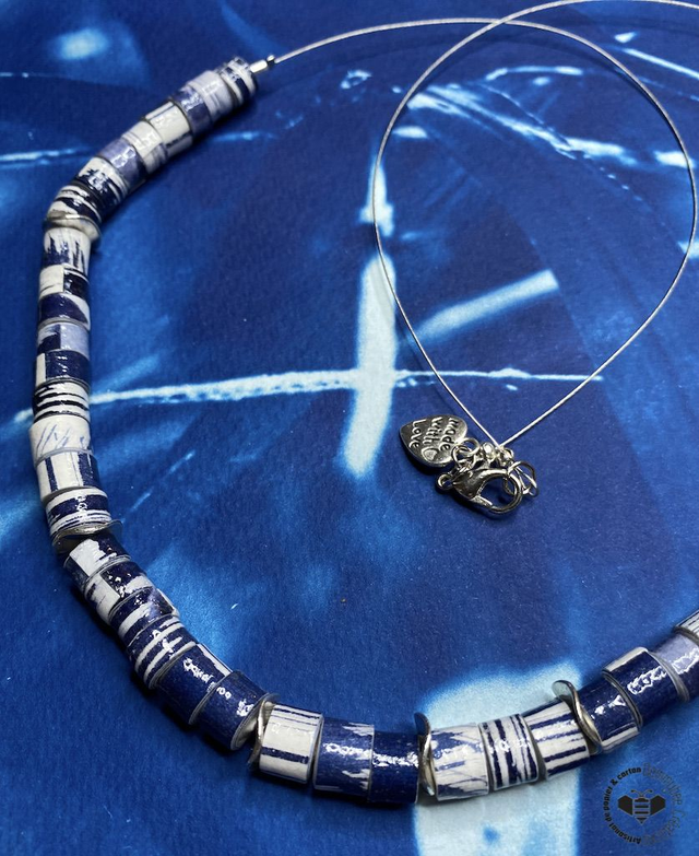 Elégant sautoir en perles de papier fabriquées à partir de cyanotypes maison.